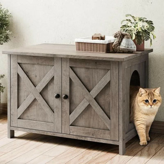 Walsunny Cat Litter Box Furniture with Removable Divider Hidden Enclosure and End Table White Brown Gray Wood Adjustable System for Personalized Configurations Double Door Design