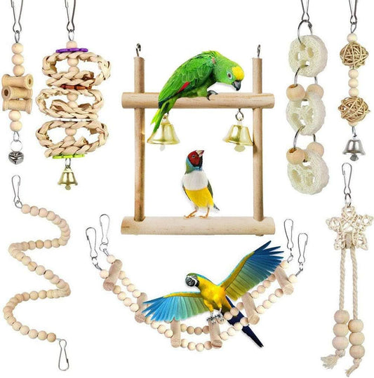 8-Pack Parrot Swing and Chewing Toys with Hanging Bells for Small Birds including Parakeets, Conures, Lovebirds, Cockatiels, Macaws, and Finches