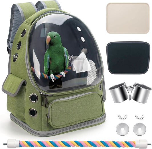 Bird Backpack Carrier Travel Cage with Perch, Tray, and Ventilated Clear Window for Cockatiels, Caiques, Conures, and Quakers - Ideal for Veterinary Visits, Camping, and Hiking (Green)
