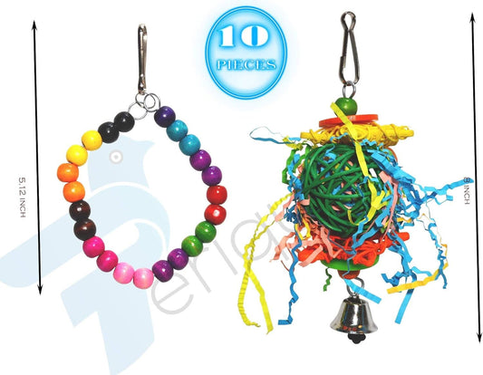 PERIQUITO 10-Piece Assorted Bird Toy Set for Parrots, Parakeets, and Small Birds - Includes Hammocks, Swings, Bells, Rope Ladders, and Perches