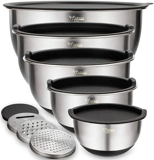 5-Piece Stainless Steel Mixing Bowl Set with Airtight Lids, Grater Attachments, and Non-Slip Bottoms - Ideal for Mixing and Serving, Sizes 5QT, 3QT, 2QT, 1.5QT, and 0.63QT
