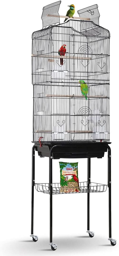 64-Inch Open Top Bird Cage with Rolling Stand for Parakeets, Cockatiels, Parrots, and Lovebirds - Black, Dimensions: 18" W x 14" D x 62" H
